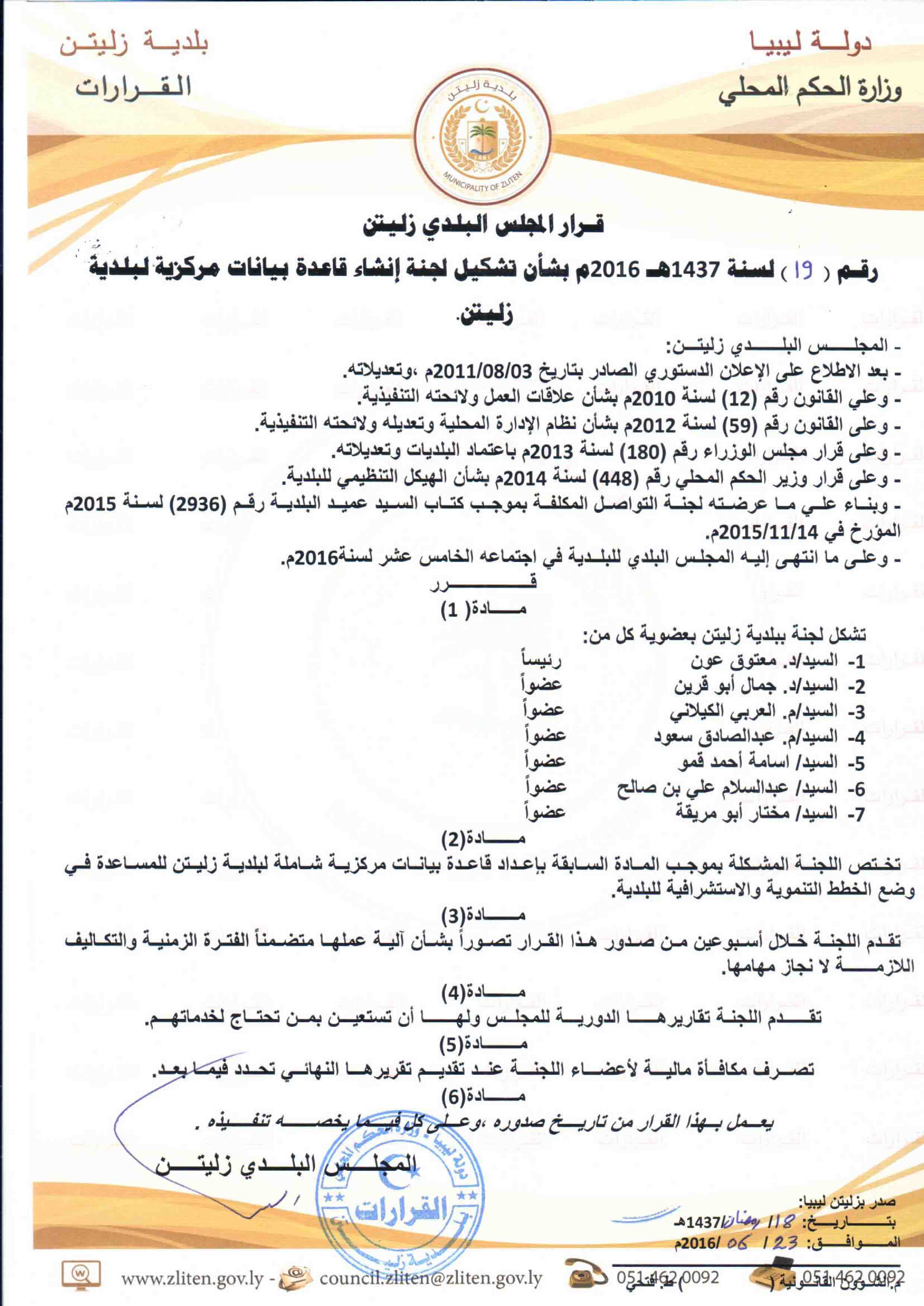 قرار المجلس البلدي بشأن تشكيل لجنة لإعداد قاعدة بيانات مركزية بالبلدية